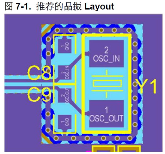 晶振 OSCIN 和 OSCOUT 两条走线要尽量短,且保持相等;包地处理,不要直接跟MCU的GND相连接。晶振表面地挖空,外围隔开地环,打孔屏蔽到主地层。