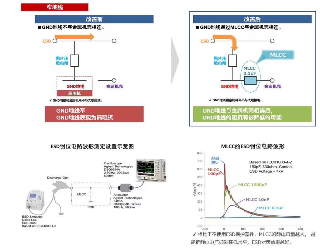 MLCC的效果:由于MLCC 0.1uF对于ESD表现为低阻抗特性,因此将GND地线和金属机壳如下图所示通过MLCC连接后,GND地线整体(包括通过MLCC连接的金属机壳)都表现为低阻抗。这样,无论GND地线的尺寸大小如何,ESD都会被贴片式压敏电阻吸收并引向GND地线释放。